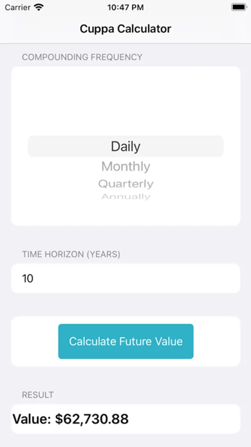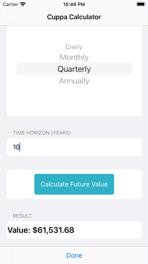 Cuppa Savings is a powerful savings calculator designed to help you effortlessly visualize and maximize your financial growth. With our user-friendly interface and customizable options, creating a tailored savings plan has never been easier or more enjoyable. Start your journey towards a prosperous financial future with Cuppa Savings today!