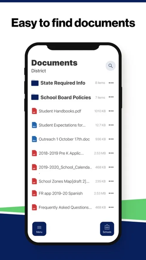 The event section shows a list of events throughout the district. Users can add an event to their calendar to share the event with friends and family with one tap.