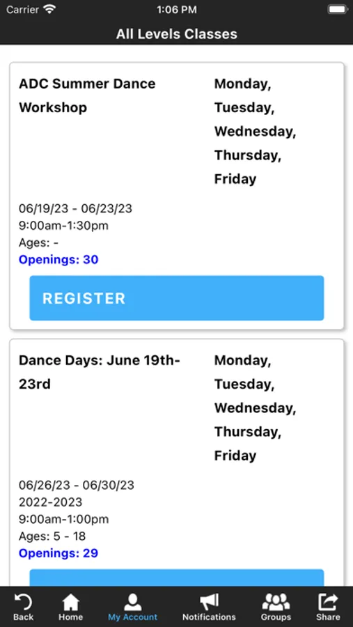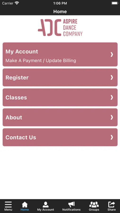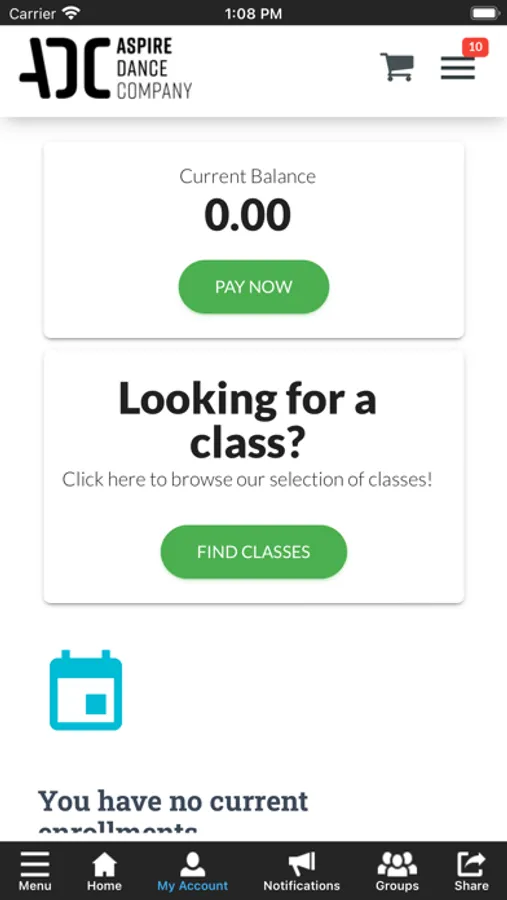 The Aspire app allows you to manage your family portal with ease, register for classes, camps, and special events. You'll also receive important notifications about class changes, closings, registration openings, special announcements, and upcoming events.