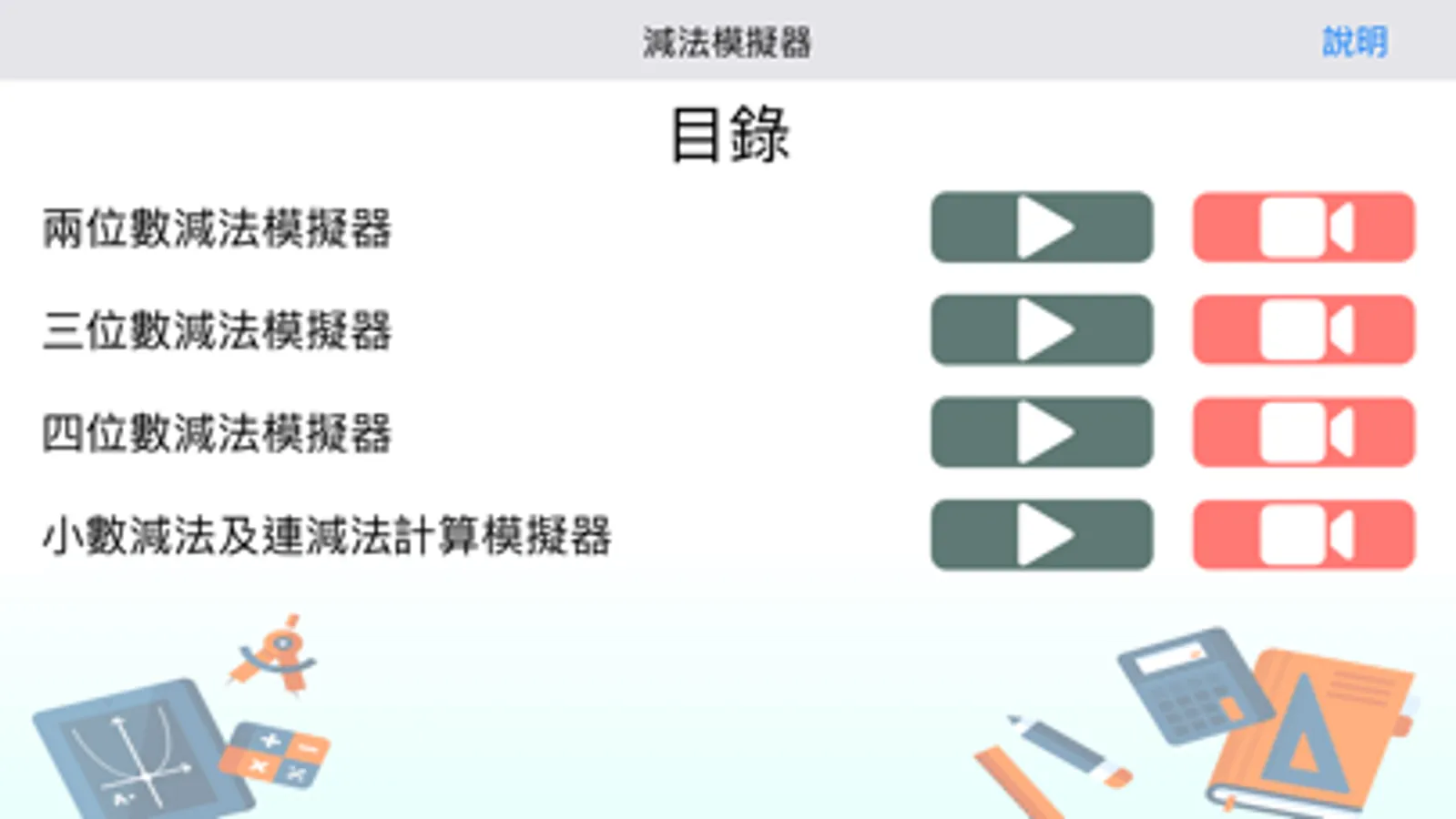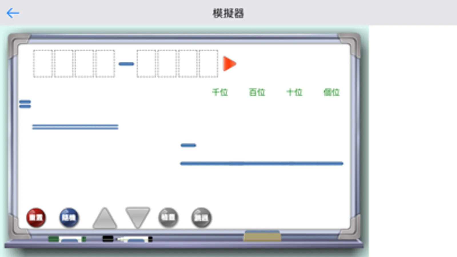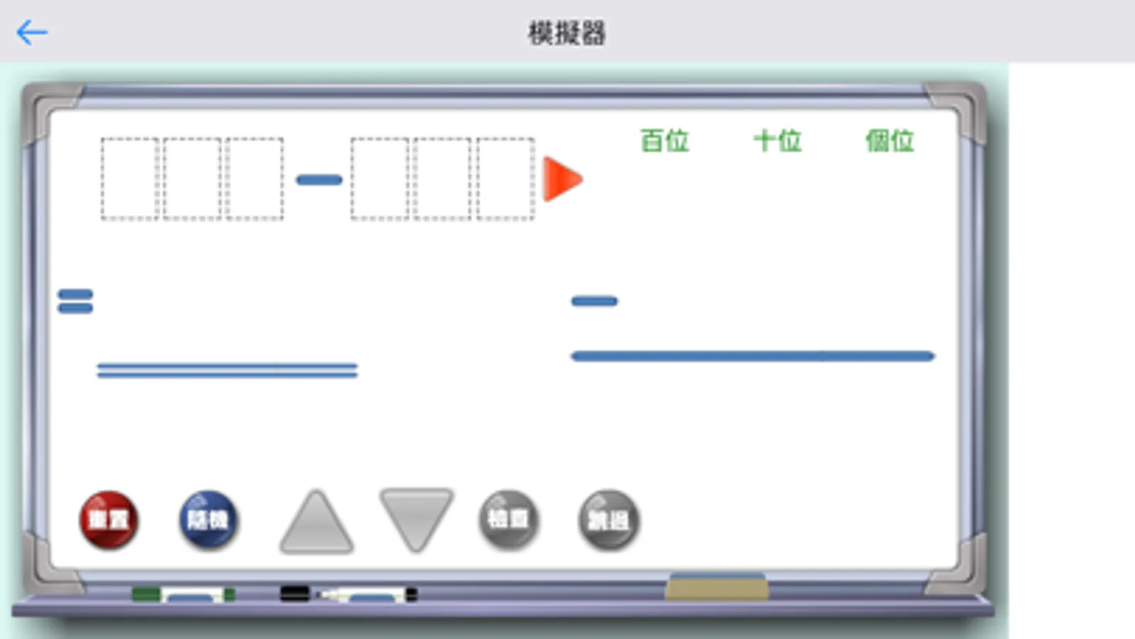 減法模擬器為「名創教育.新亞洲出版社」所研發的減法計算應用程式;透過提供不同形式的減法類型模擬