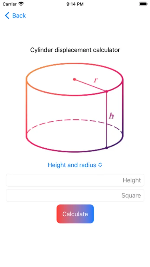 • Cylinder displacement calculator: Calculate the volume of a cylinder using its height and base radius.
