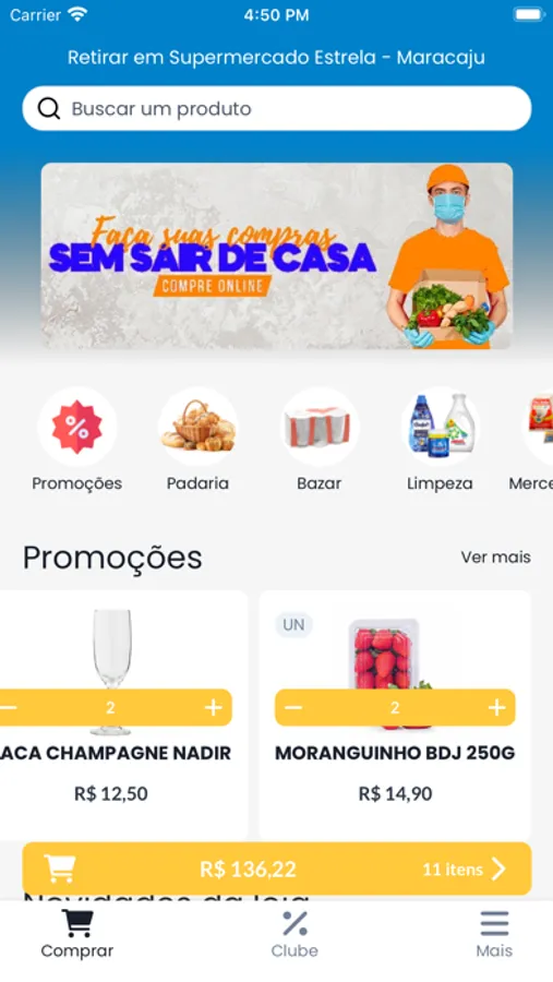 Com o aplicativo Sup Estrela você tem acesso aos descontos exclusivos do Clube. Além disso, você pode fazer suas compras pelo celular em qualquer horário e agendar a entrega das mercadorias.