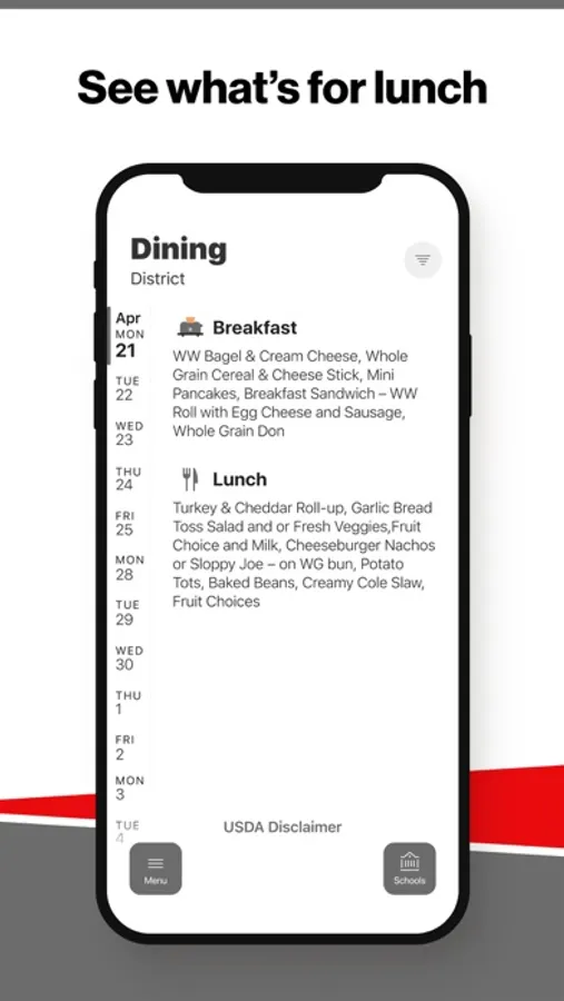 Within the dining section, you'll find an easy to navigate, weekly menu, sorted by day and meal type.