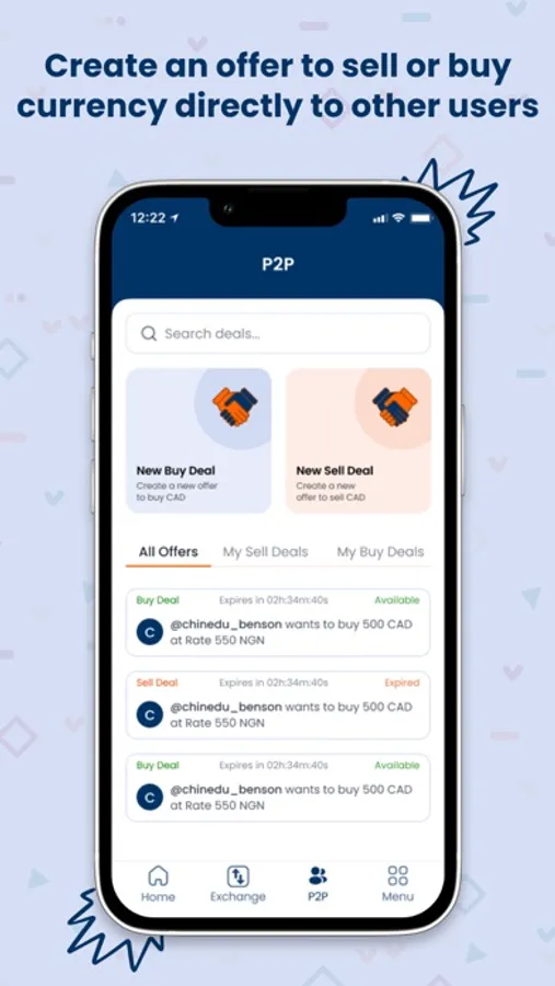 Users create a wallet account (with due diligence and KYC procedures), fund the wallet to create a buy or sell deal or swap one currency for another.