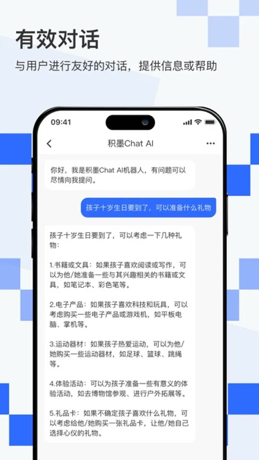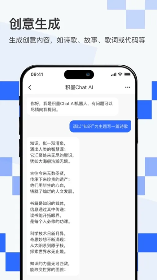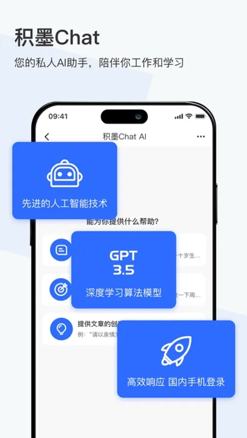 积墨Chat直观且对用户友好的界面使您很容易与之互动,并回答您提出的各种问题,执行许多任务,具有无限的可能性: