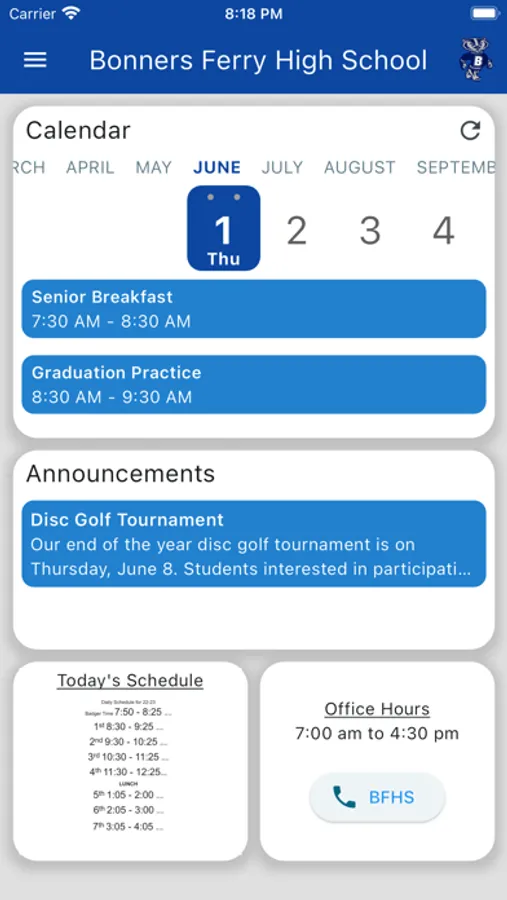With the official Bonners Ferry High School App, you can stay informed with all things Badgers, including calendars, announcements, sports, news, and more. Students and parents can stay up-to-date with school events and schedules. Never miss important announcements with push notifications sent directly to your device.
