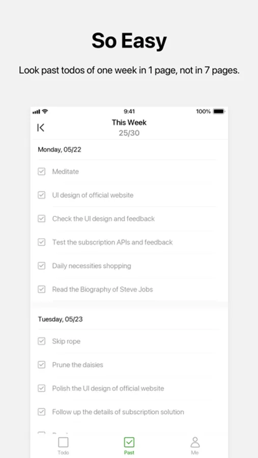 View all the coming todos in 1 page, not in N pages; Look past todos of one week in 1 page, not in 7 pages; No complex data statistics, positive feedbacks of simple number only—all can be viewed immediately on first level pages.