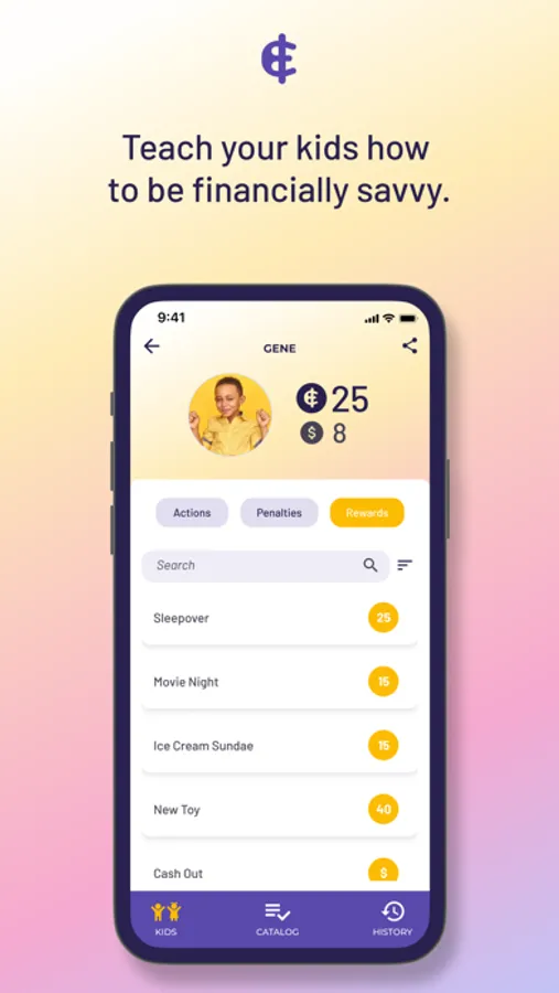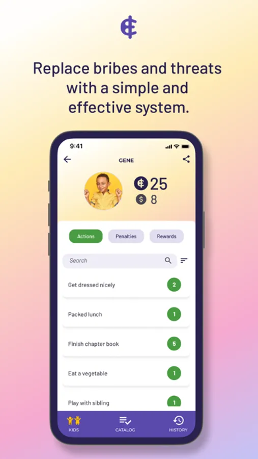 - Personalized family currency that kids earn, or lose, for their behavior