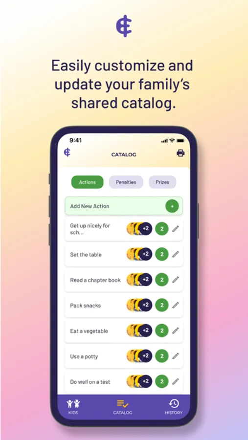 - Customizable catalog of actions, penalties, and rewards