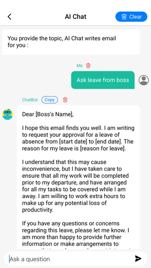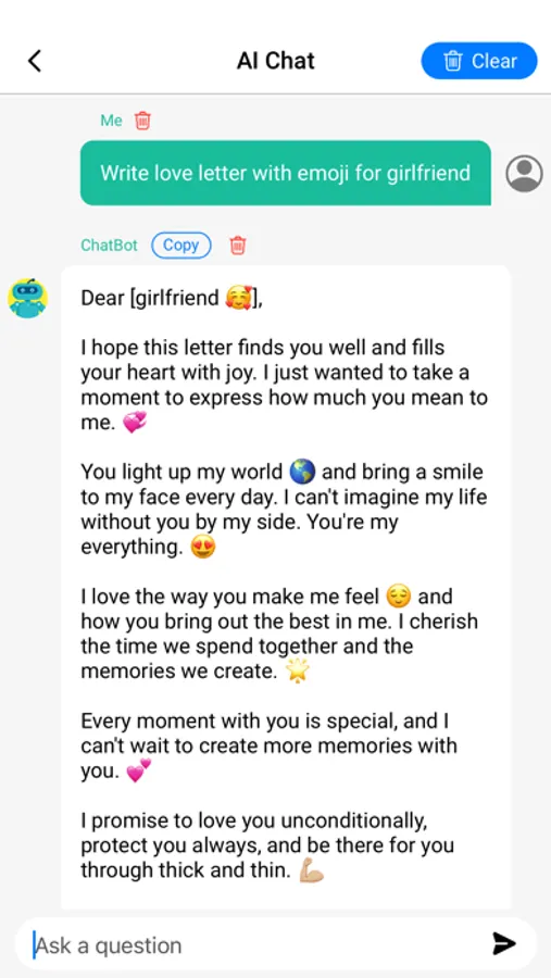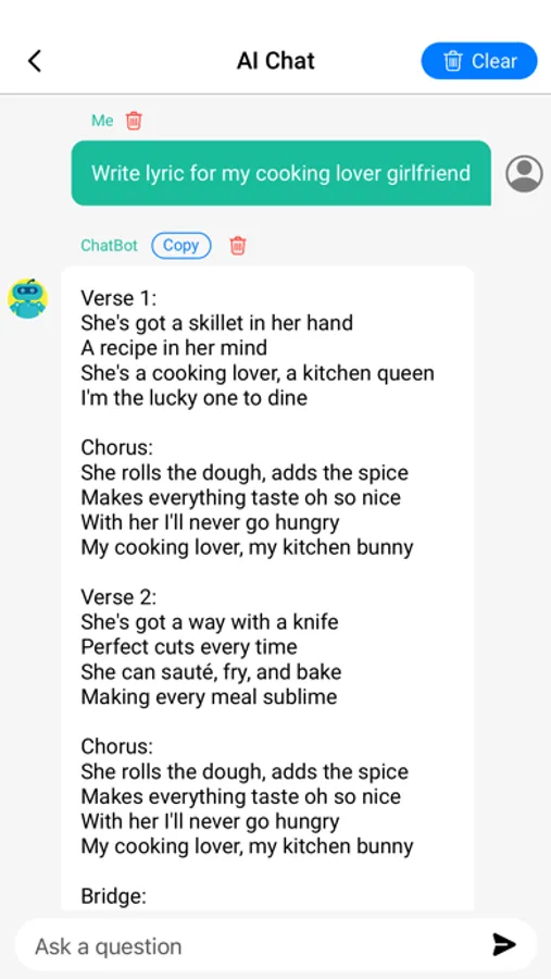 With AI Chat, you have access to personalized assistance for all types of writing projects, whether it is essays, compositions, social media posts, or poems. Basically, the app can assist with any task, such as crafting a unique and unforgettable pickup line or even creating an original song. That's right! This AI helper is not only smart but also creative. Let your imagination run free with it!