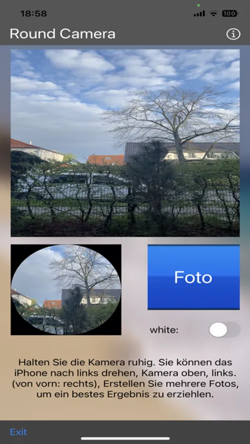 Take round pictures with this camera app and save them to photo album instantly. The wide-angle or ultra-wide-angle or telephoto or front camera is used to achieve an optimal result. It's not a fisheye effect, but comes very close. You can trigger the photo with the blue button or with the volume buttons. The resolution of the finished photos is 3200x3200 pixels. You can set whether the border should be black, white or without a border. Saving the image in color or bw/ws.