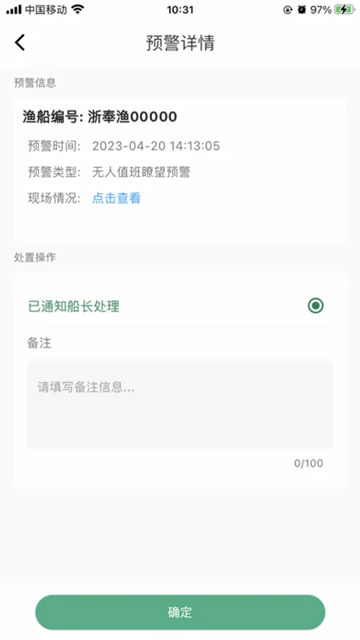 从渔船和船员角度出发,监测渔船八种预警,当渔船进入风险区或者船员发生不安全行为时,系统第一时间向app发送警报信息,监管人员可通知船上人员及时进行处理,实时分析船内外监控视频数据,实现可视化展示和提供渔民海上救助,全面提升安全作业和应急处突水平。