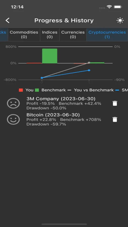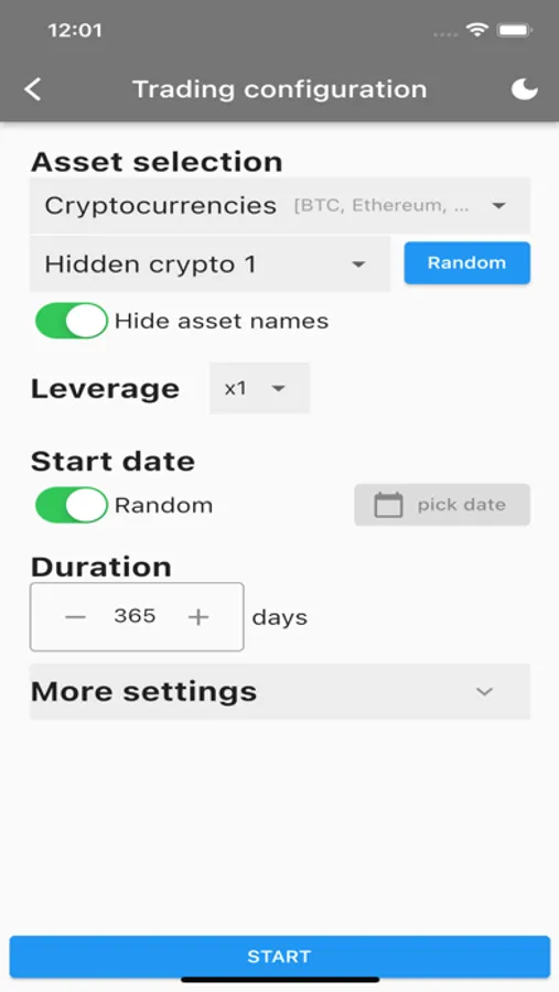 To prevent you from relying on your prior knowledge and potentially achieving unrealistic profits, the app has the capability to conceal actual asset names, prices, and dates. This ensures that you base your decisions solely on the indications of your trading strategy rather than external factors, resulting in a more accurate assessment of your strategy's effectiveness.