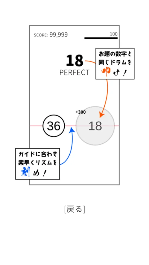 ガイド線やリズムに関係なく、直前に叩いた瞬間から一定時間以内に次のドラムを叩ければ、大きいスコアが得られます。