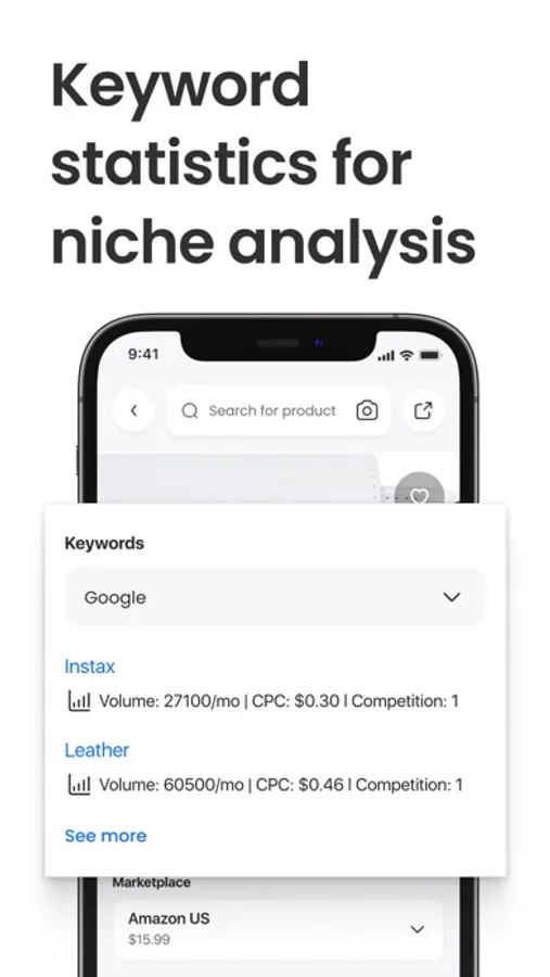 Get helpful tips based on 19 marketplaces data about any product to find winning niches, evaluate product performance, and understand your potential market share. Get instant keyword statistics in the search field.