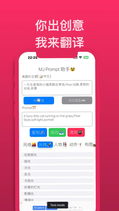 Prompt助手可以翻译您的中文绘画描述,同时为您提供大量专业的Prompt词汇,让您突破语言、词汇障碍,尽情释放创意。