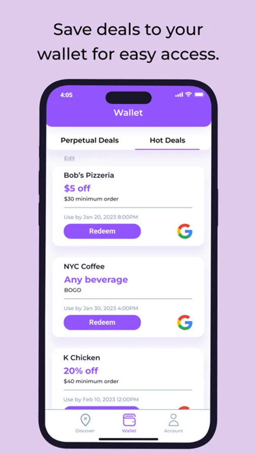 Save deals to your wallet for easy access to redeem at your favorite local businesses.