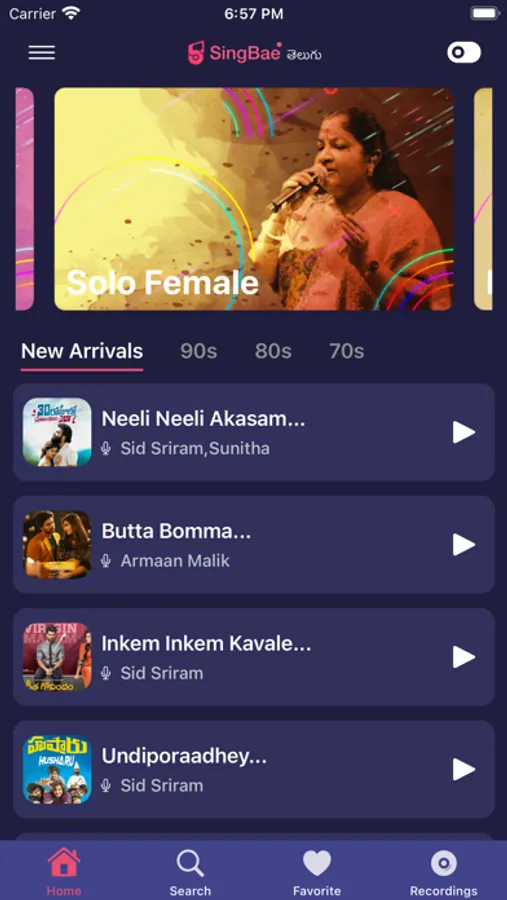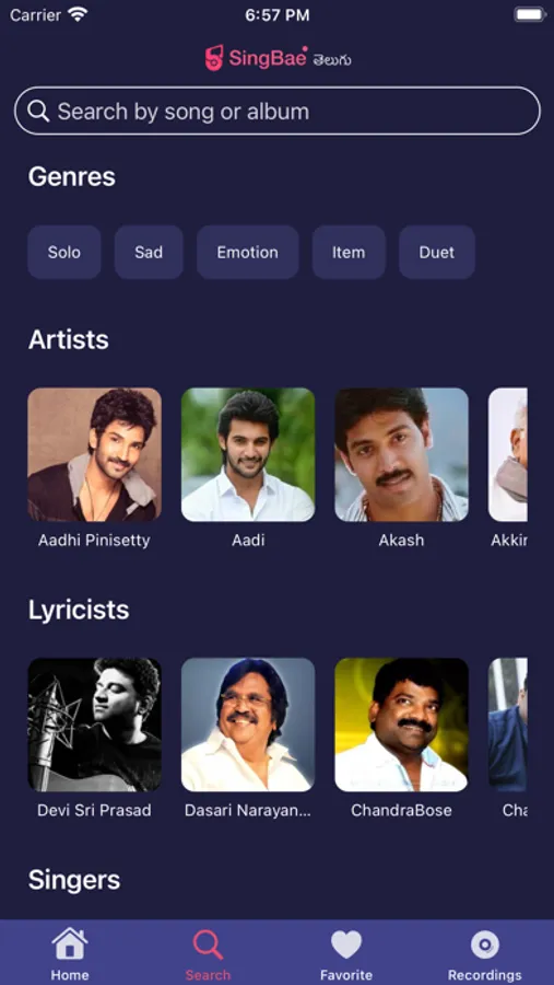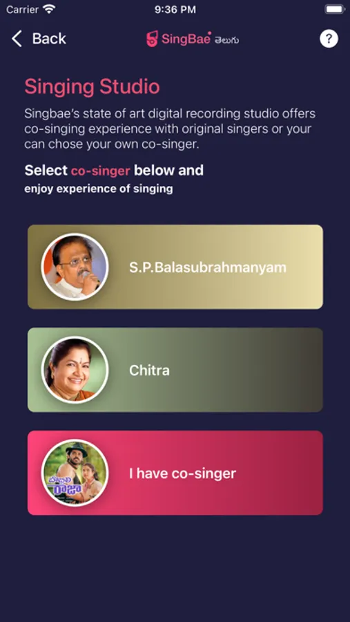 SingBaė Lite is a Telugu karaoke app that has one goal in mind, delivering the ultimate karaoke experience. It is built with your wishes in mind! Ever wanted to sing your favourite track with the Original Artist?! Well, with SingBaė, you are one step away from collaborating with industry-leading singers on the best-hits! we made it possible with our advanced "SingBaė Singing Studio" which is first of its kind.