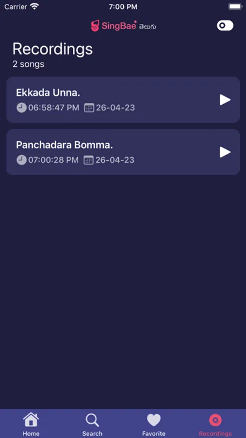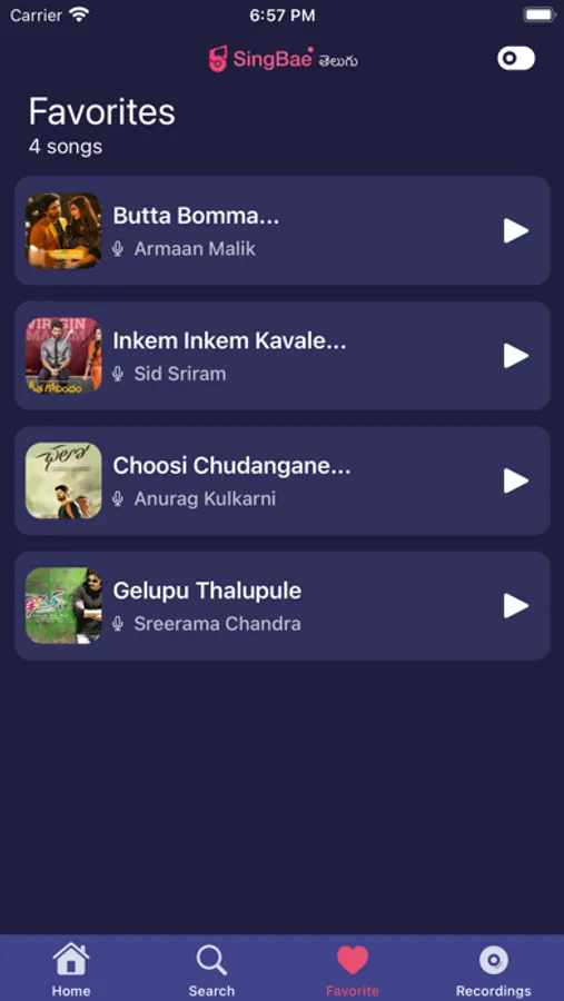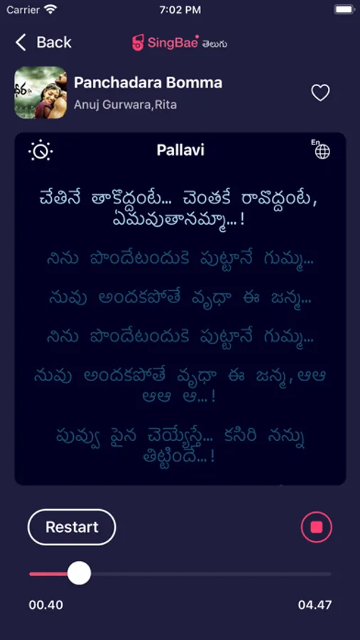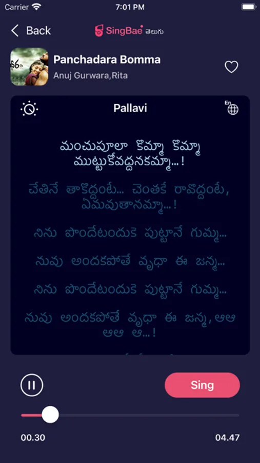 Whenever you sing, you can view lyrics in dual languages – English & Telugu, these lyrics are time-synced with the song. This lets you focus on what’s most important, i.e., your amazing singing ability.