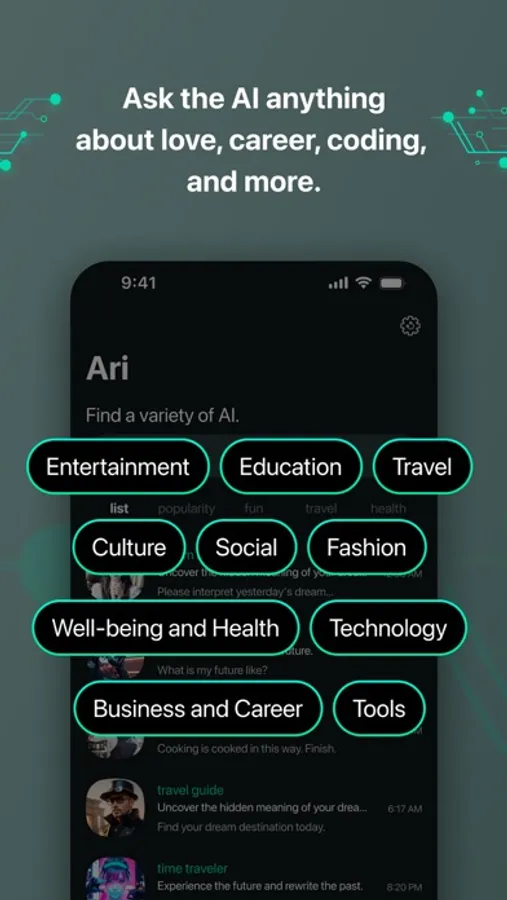 Enjoy conversations with various AI for free, and have a rich experience with Ari, who can help with anything from love advice to fortune-telling and studying.