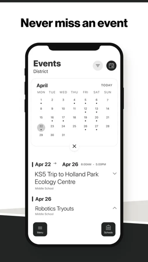 The event section shows a list of events throughout the district. Users can add an event to their calendar to share the event with friends and family with one tap.