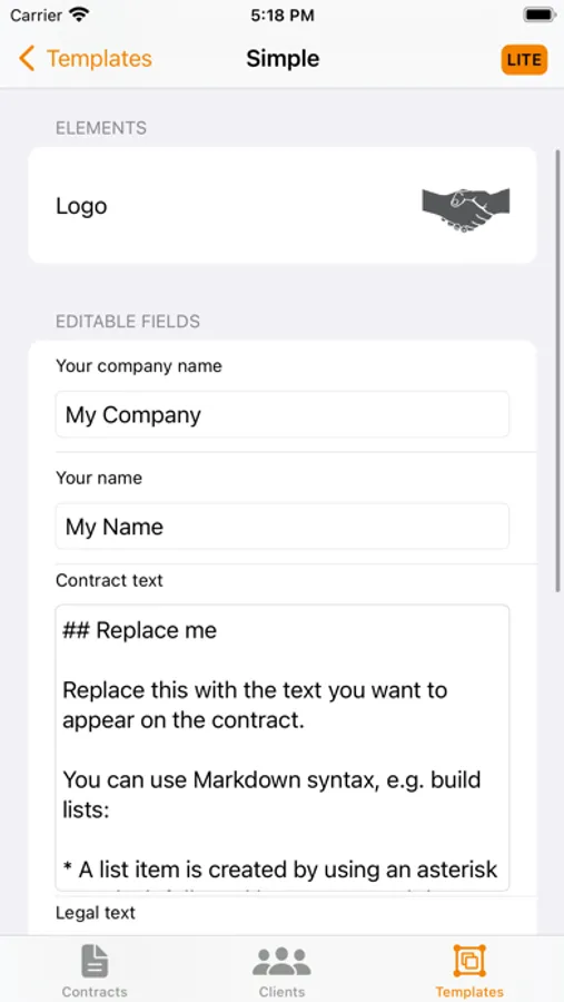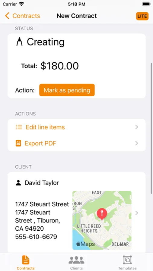 Type in your info and items, pick your client info from Contacts, send the ready-to-sign contract as a PDF.