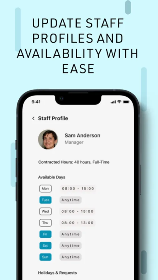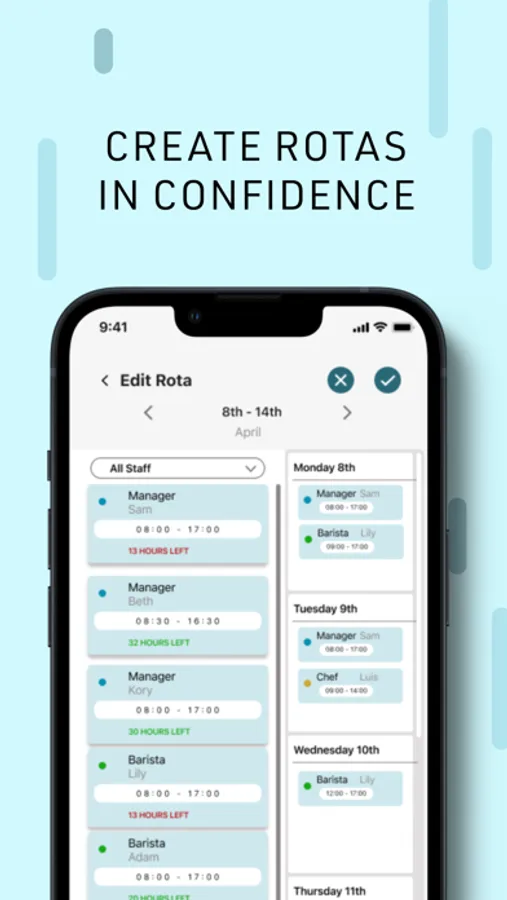 ROTA SCHEDULING - Compile and manage your staff rota conveniently. Collect and maintain contracted hours and employee availability, enabling managers to schedule rota effortlessly.