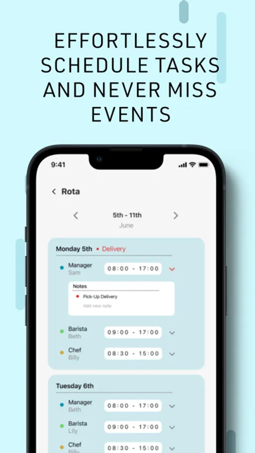 TASK MANAGEMENT - Clearly communicate specific tasks to your staff for each shift. Integrated directly within the app, this feature helps ensure everyone knows their duties for the day.