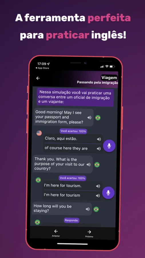 Nossa plataforma permite que você pratique seu inglês com um simulador de conversas sem medo de errar e sem medo de ser julgado!