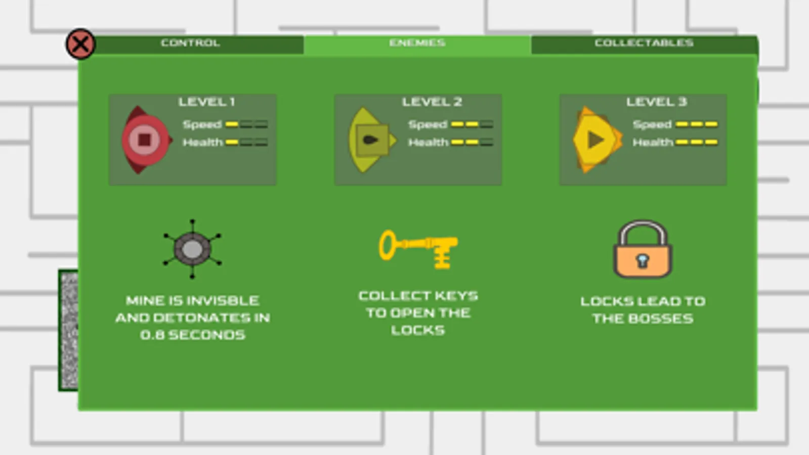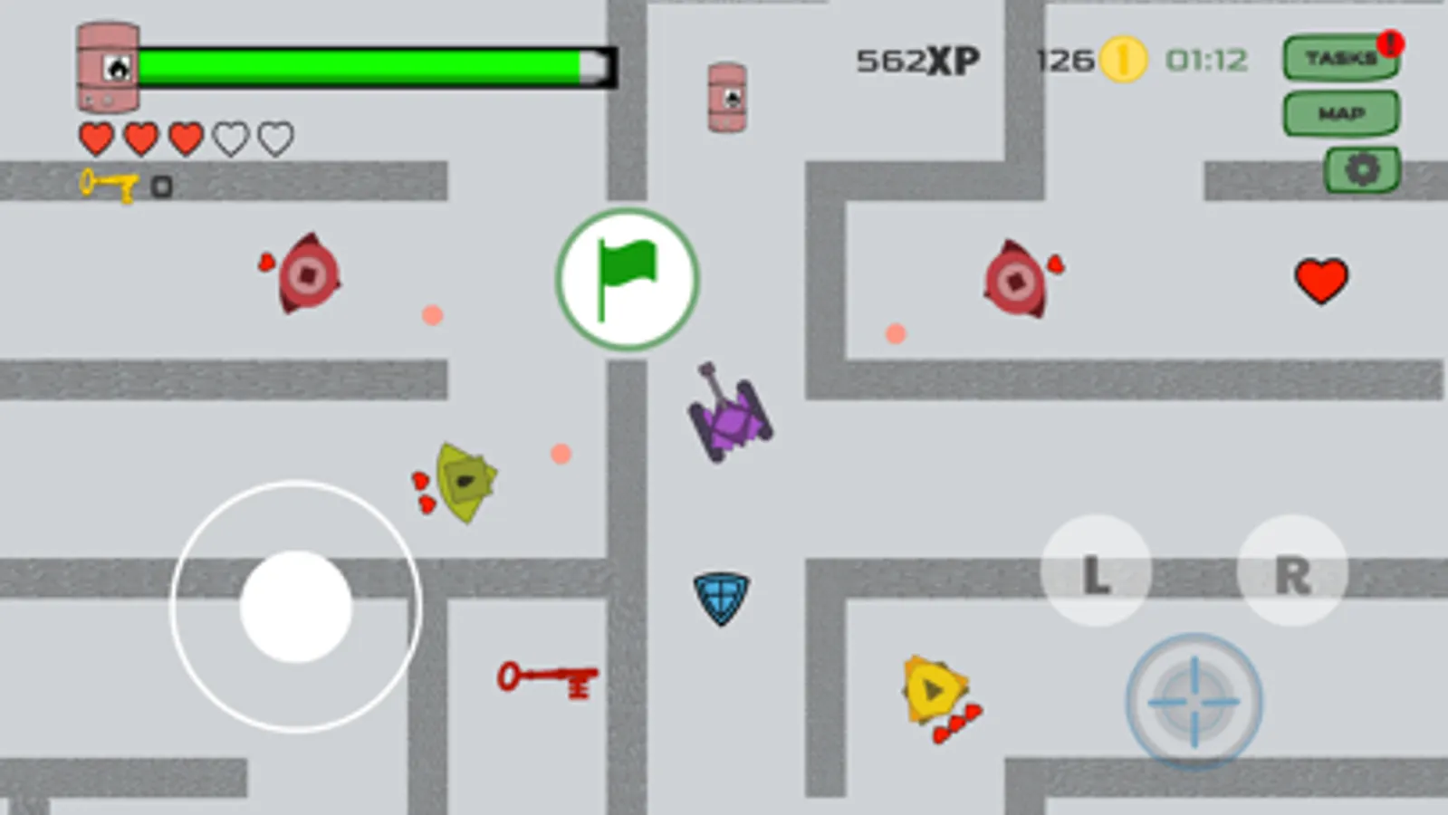 Explore the maze dodging the hostile bullets and destroying the foes. Collect shields, extra lives and fuel barrels to stay in the maze as long as you can. The longer you remain in the labyrinth, the higher the chances to collect all the keys. Once all keys have been collected, hurry to open the lock and brace yourself for meeting a boss. If you need some XP pick up a flag and deliver it to a drop-off point. The faster you are the more XP you receive.