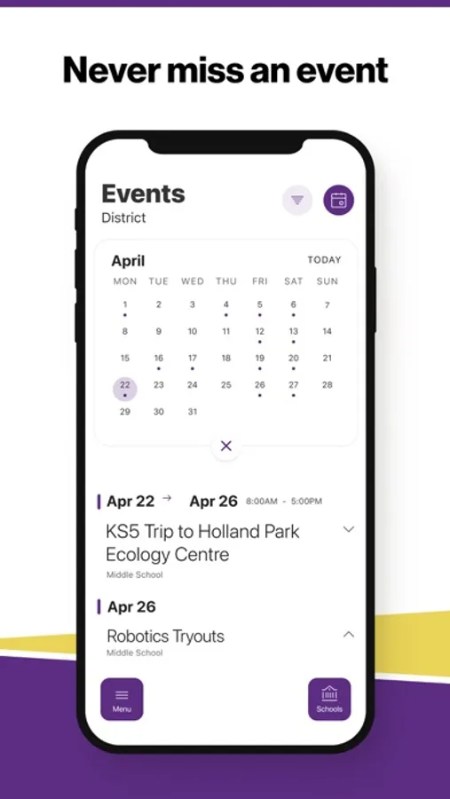 The event section shows a list of events throughout the district. Users can add an event to their calendar to share the event with friends and family with one tap.