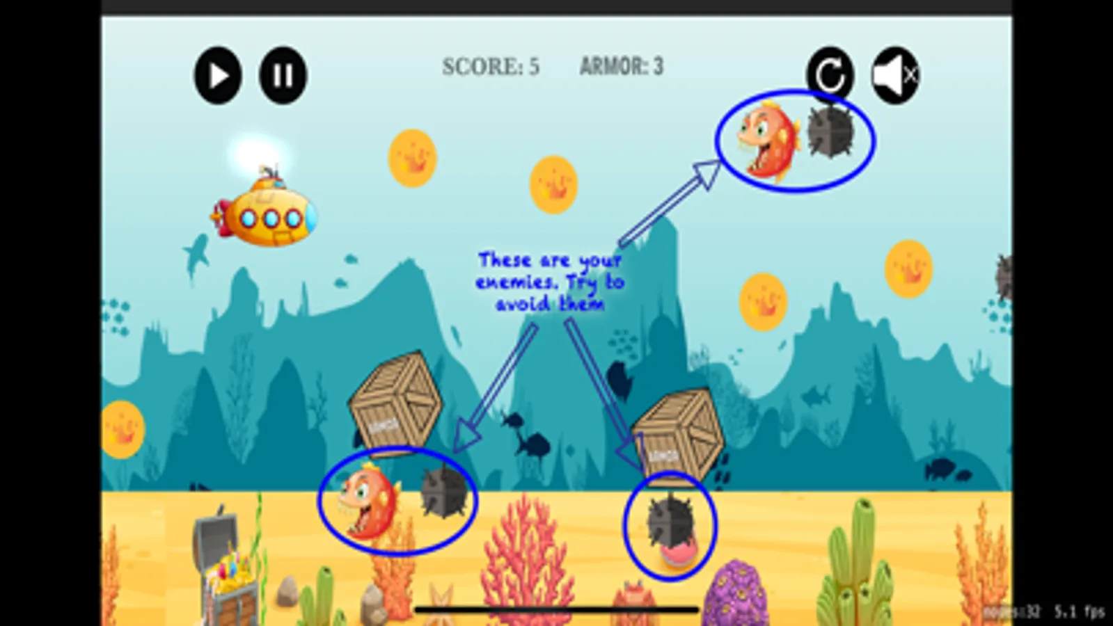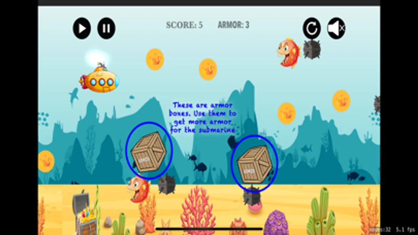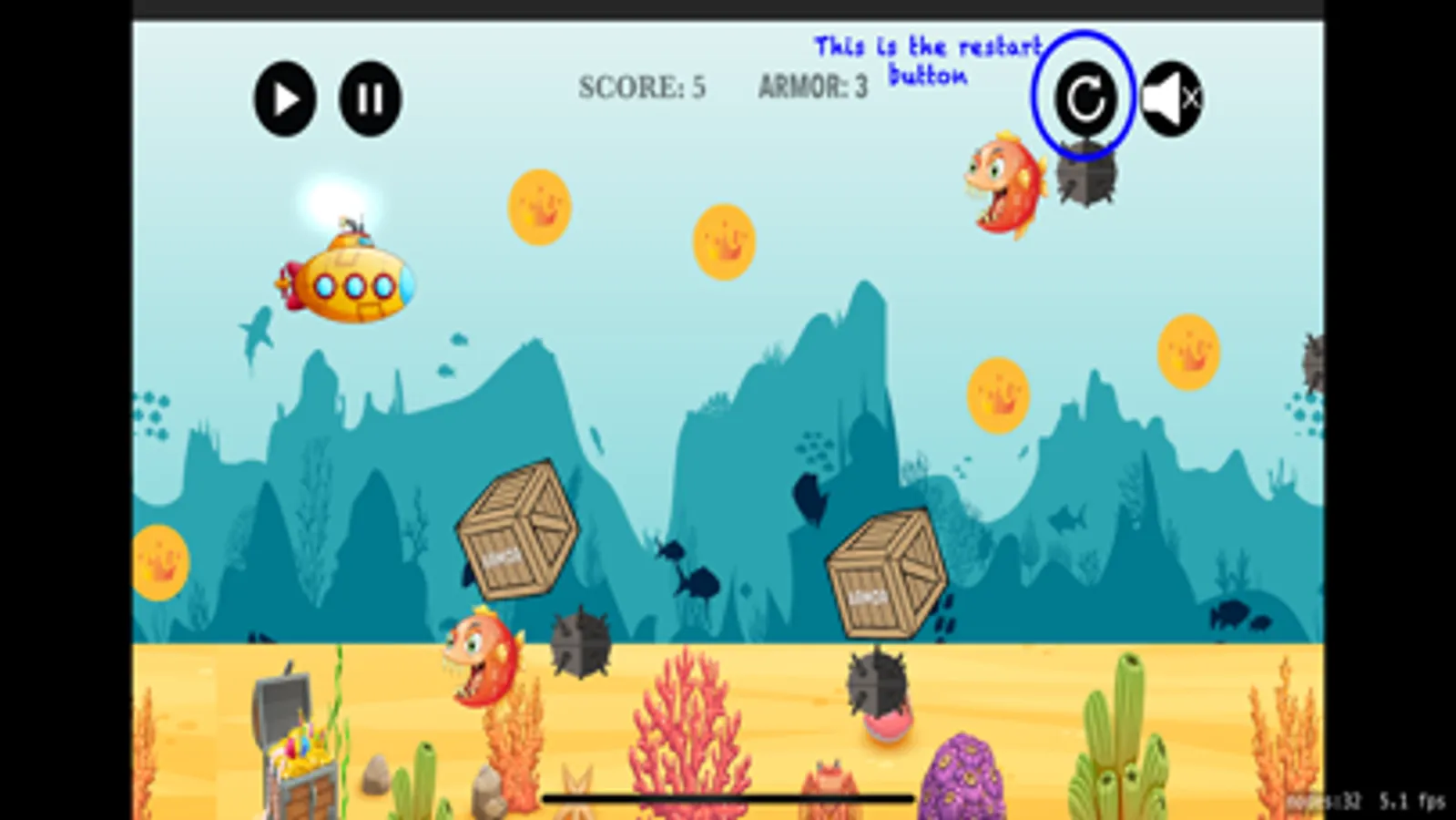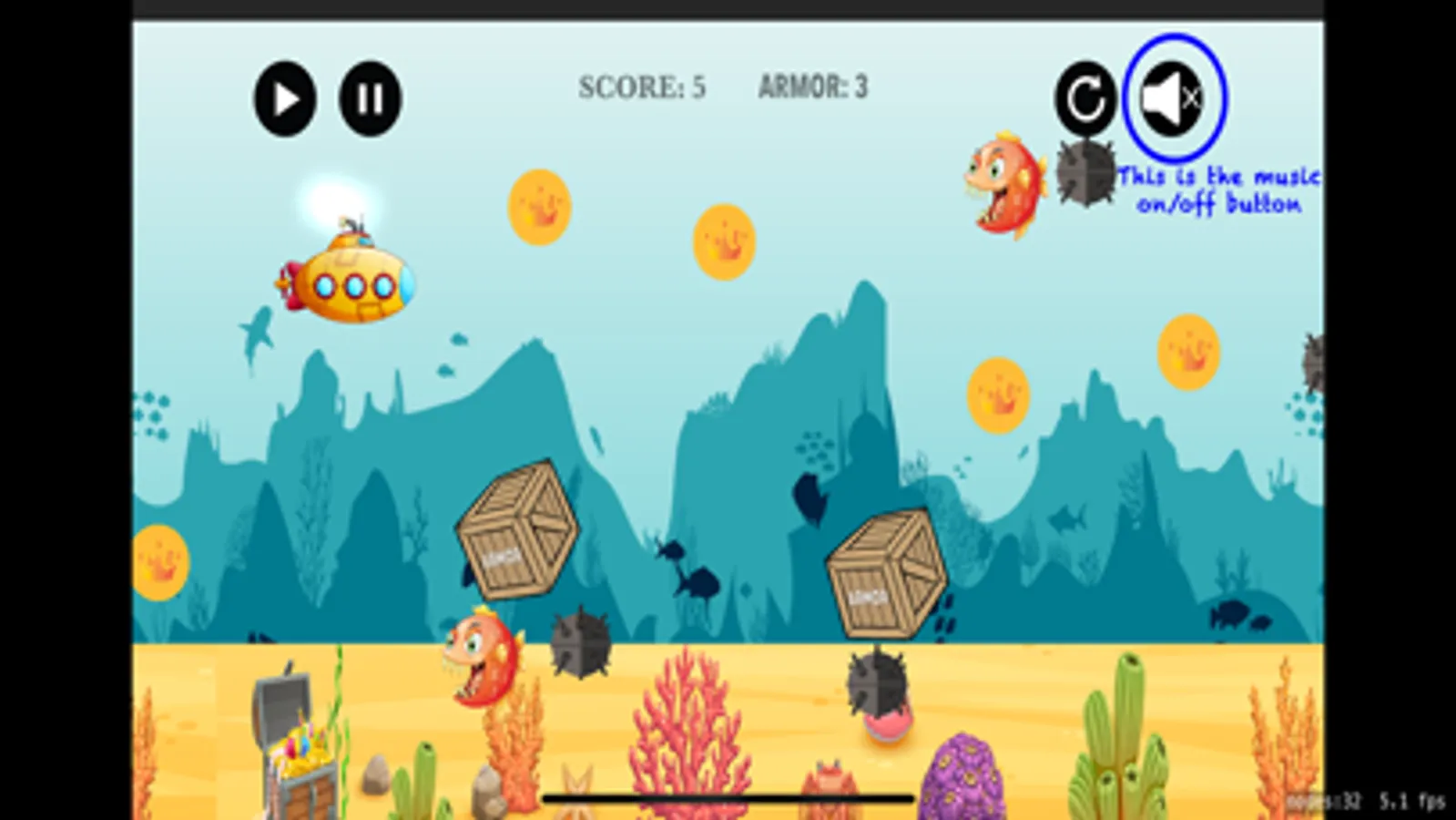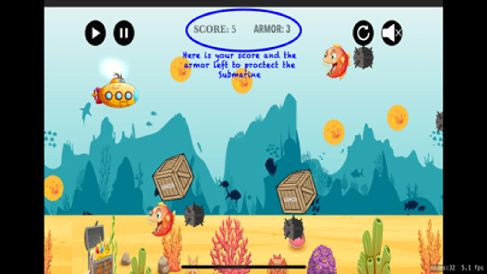 In this game you play as a submarine trying to make it home as it is lost. The Crusty Sub is little and not working very well as it has taken some damage while trying to make it through a mine field. There are many dangers in the sea and one of the greatest one, besides mines, is the mean red fish. This fish is fast, tenacious and it is poise to get the Crusty Sub. As the submarine operator, you need to avoid this fish at all cost, as it will take the most points out of your protective armor. There are treasure coins scattered around the sea, try collecting them so you can increase your score and have a way to use them for repairing the Crusty Sub.