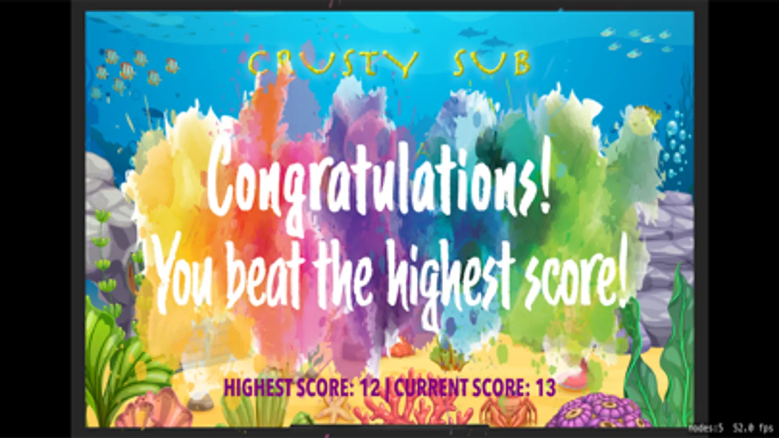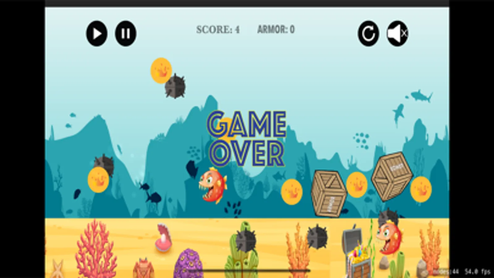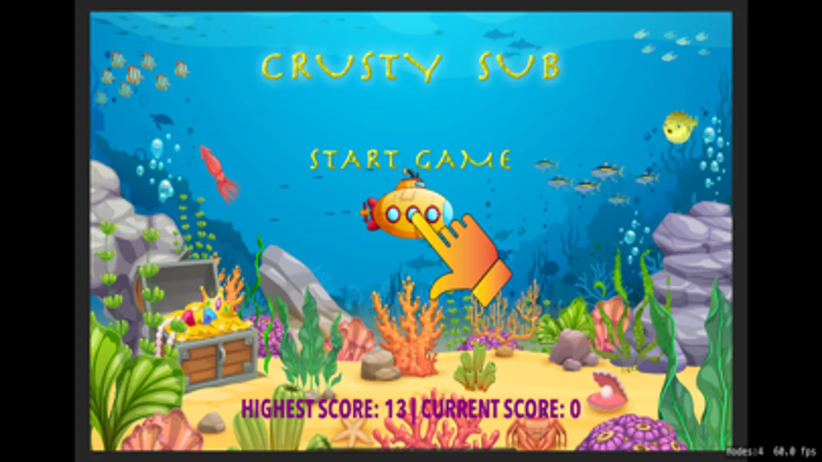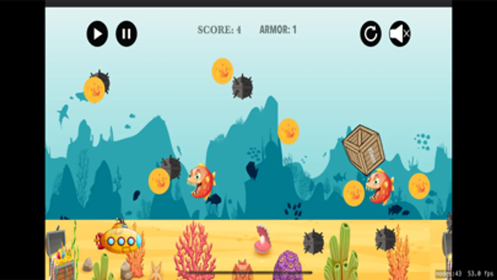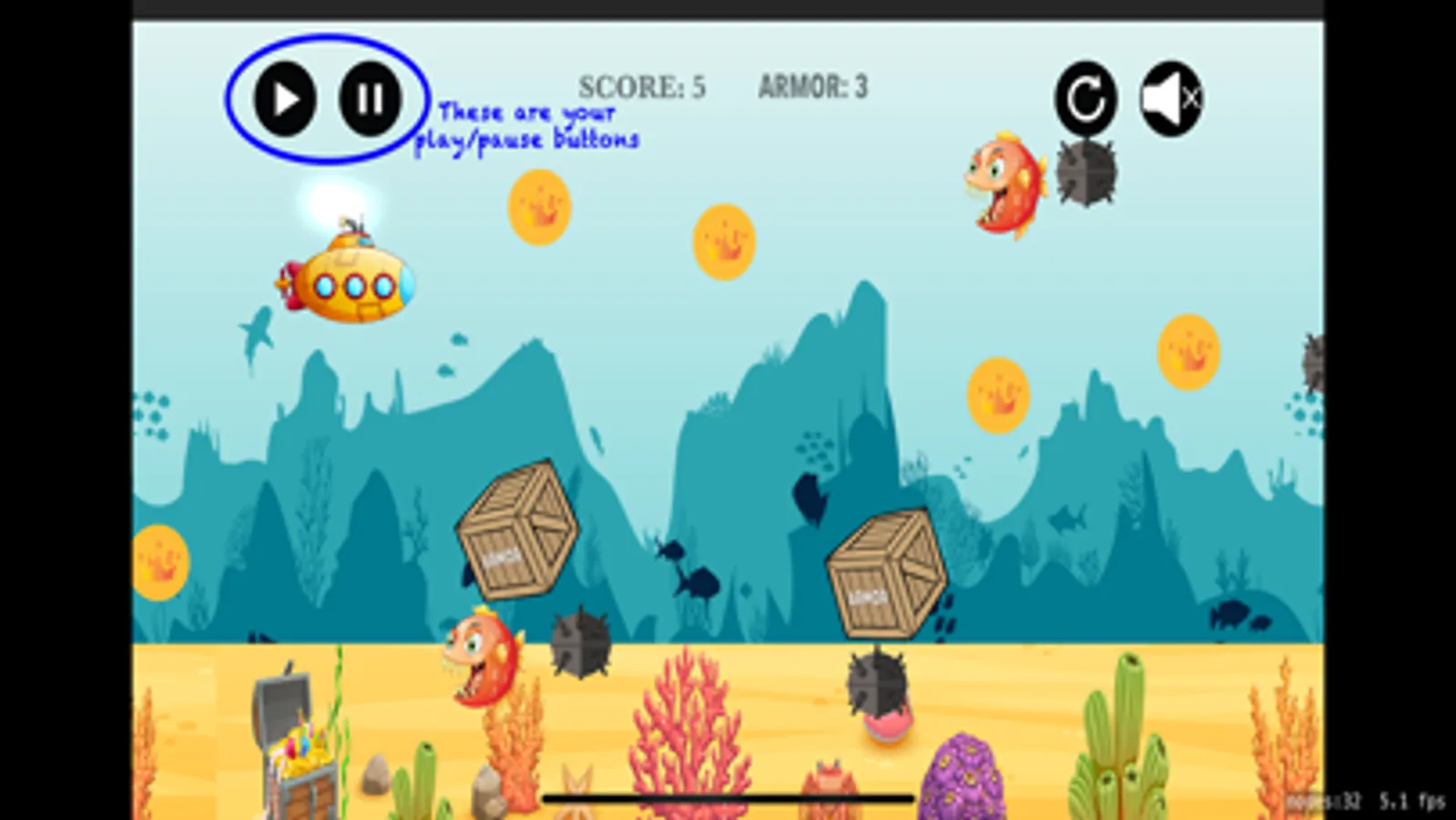 In this game you play as a submarine trying to make it home as it is lost. The Crusty Sub is little and not working very well as it has taken some damage while trying to make it through a mine field. There are many dangers in the sea and one of the greatest one, besides mines, is the mean red fish. This fish is fast, tenacious and it is poise to get the Crusty Sub. As the submarine operator, you need to avoid this fish at all cost, as it will take the most points out of your protective armor. There are treasure coins scattered around the sea, try collecting them so you can increase your score and have a way to use them for repairing the Crusty Sub.