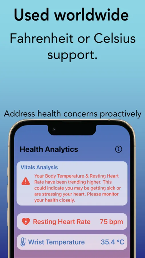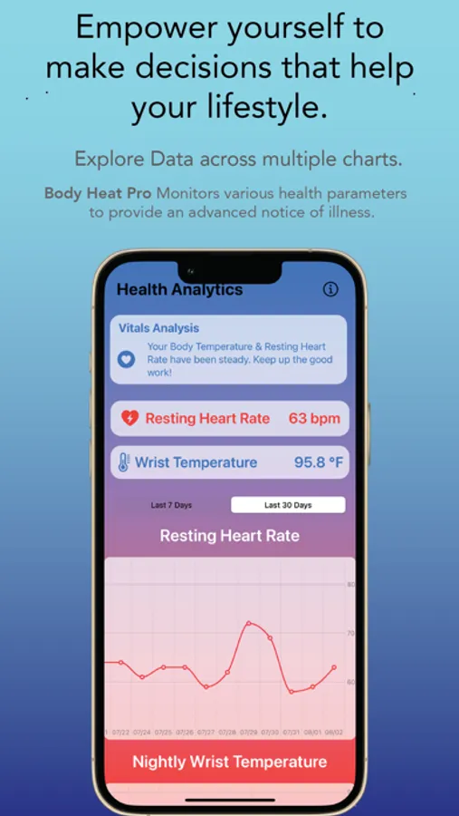 Introducing Body Heat Pro, the cutting-edge app designed to help you stay ahead of potential issues by monitoring certain health parameters alerting you of sickness before it arrives. By analyzing these signs, Body Heat Pro provides valuable insights into your current lifestyle, so you can take action before symptoms appear.