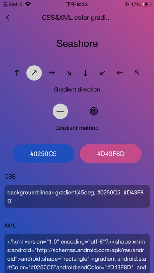 8. Gradient color: supports switching gradient methods, generating XML and CSS gradient codes online;