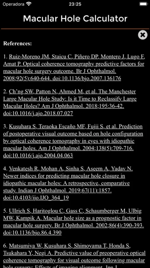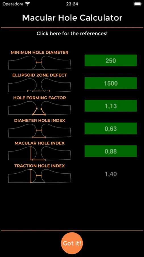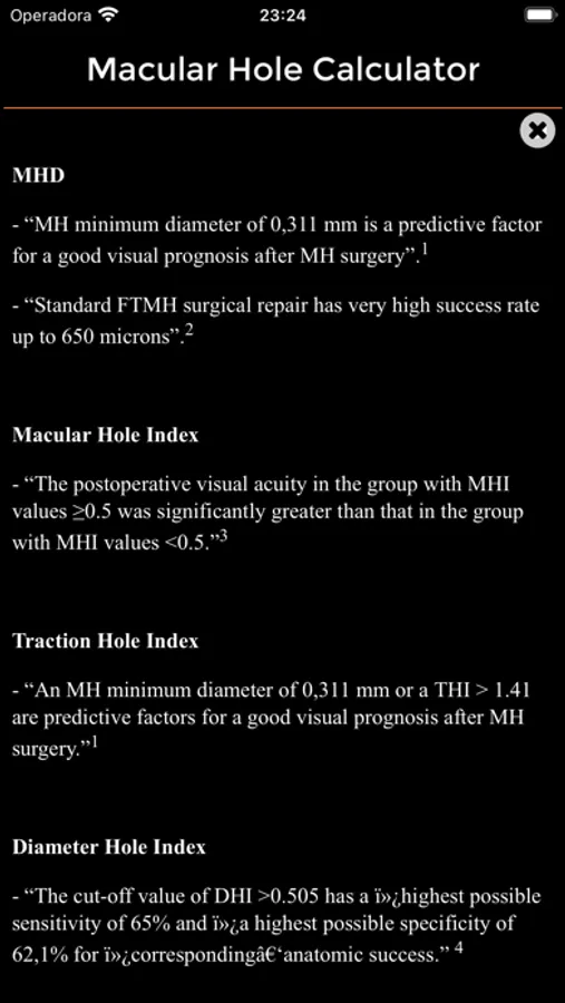 This is an application that enables the correlation of preoperative optical coherence tomography (OCT) findings on macular hole (MH) with predictive factors for successful surgery outcomes for retina-vitreous surgeons. This application utilizes specific indices, including Macular Hole Index (MHI), Diameter Hole Index (DHI), and Tractional Hole Index (THI) using quantitative parameters of MH on OCT such as maximum outer diameter, minimum diameter between edges, height, nasal and temporal arm lengths, height, and ellipsoid zone defect, that can define different prognostic results. Overall, it allows for a more accurate prediction of surgical outcomes and enhances the ophthalmologist's ability to provide optimal patient care.