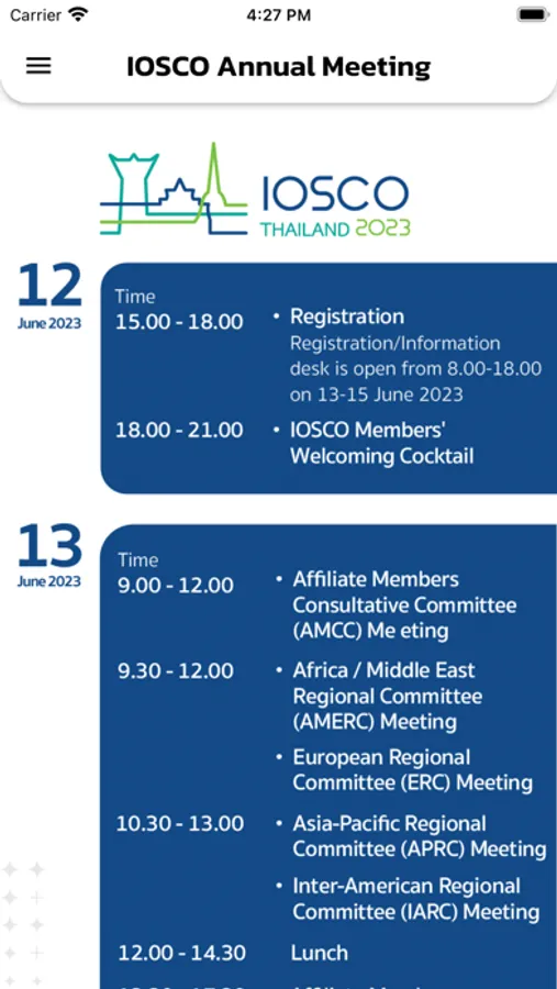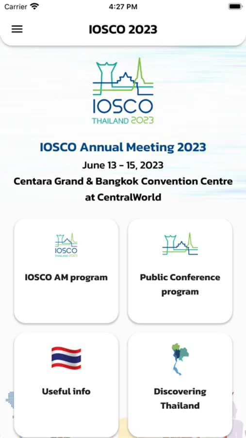 IOSCO 2023 Thailand is the official application for the 48th IOSCO annual meeting which will be held during 13-15 June 2023 and followed by the SEC Thailand Public Conference on 16 June 2023 at Centara Grand & Bangkok Convention Centre at CentralWorld, Bangkok, Thailand.