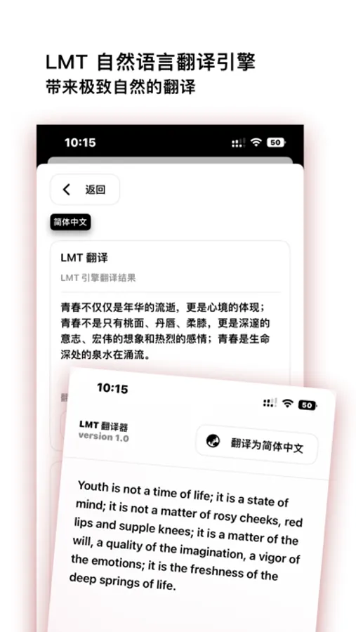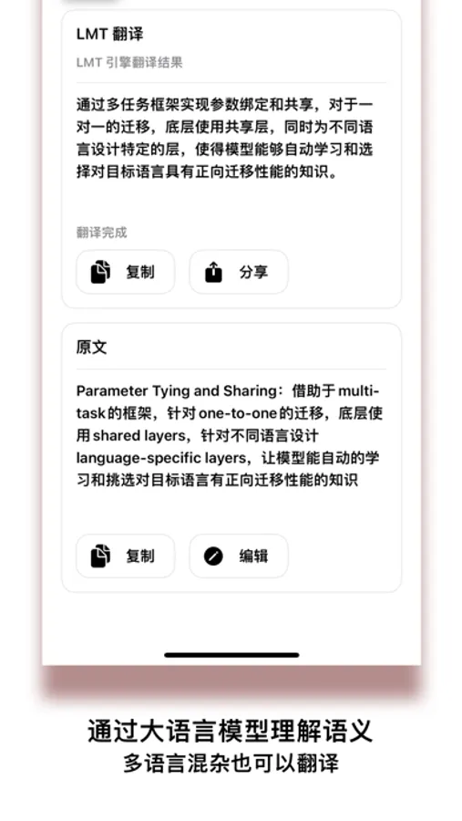 LMT 使用的大语言模型在生成翻译时倾向于将译文写得结构逻辑清晰,语法正确,简洁生动。这会是您在和其他语言使用者进行沟通时的有力工具。
