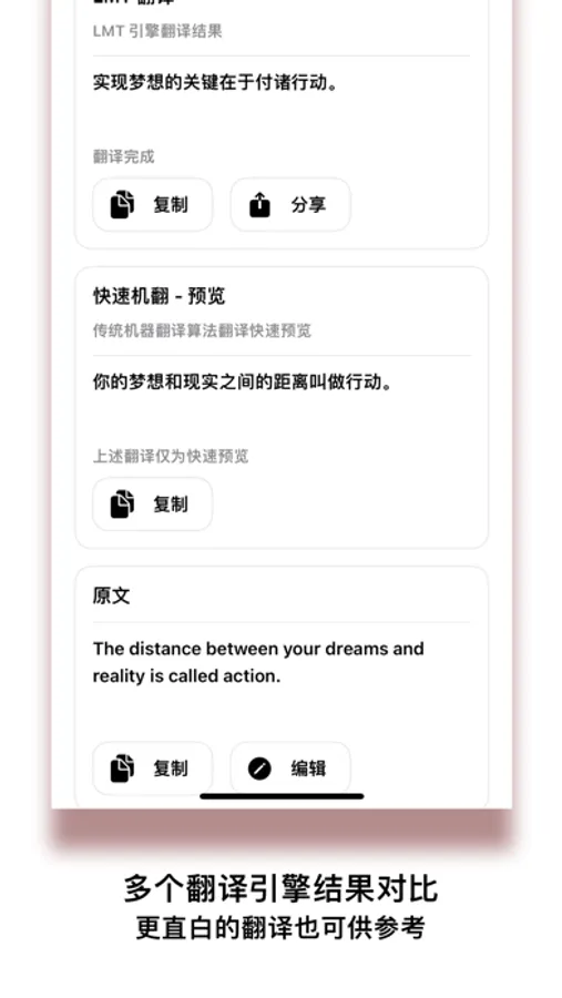 传统机翻快速而直接,LMT 引擎翻译相对较慢但是自然,我们提供了两种引擎的翻译结果。不仅有词词对应的机翻模式,还有经过加工润色的 LMT 翻译结果。