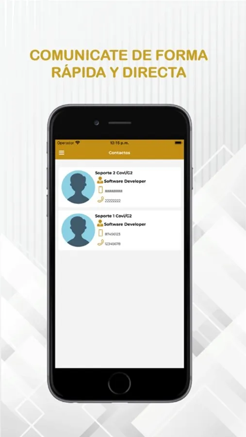 Contactos: Aquí encontraremos un listado con los principales contactos del condominio, si desea llamarlo o enviarle un correo solo debe de presionar el número de teléfono o el correo electrónico y se podrá poner en contacto de manera inmediata.