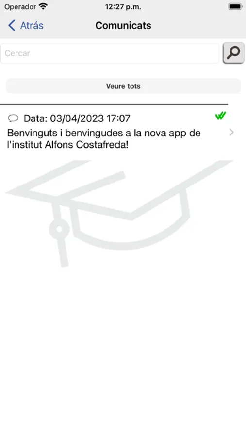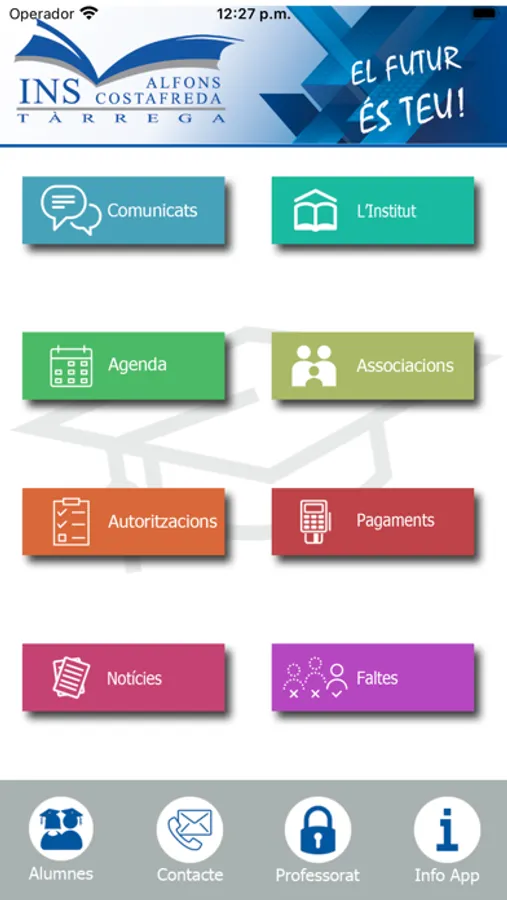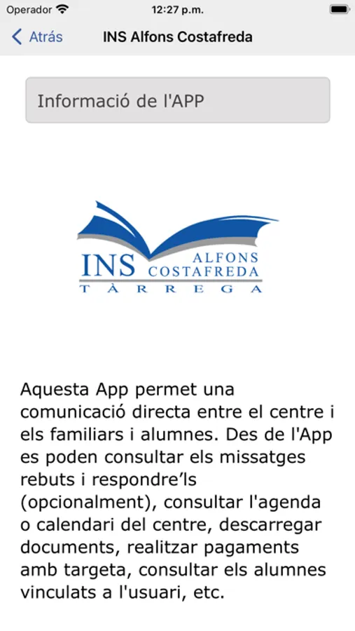 APP de l'Institut Alfons Costafreda de Tarrega. L'aplicació permet una comunicació directa entre el centre i els pares dels alumnes. Consta d'una primera pantalla de registre on s'identifica l'usuari. A continuació apareix un menú amb diverses opcions: secció de comunicats enviats per l'Institut -ja siguin comunicats generals o personalitzats-, l'Institut, agenda d'esdeveniments, associacions, documents i autoritzacions, secció pagaments, notícies, faltes. A la part inferior es mostren les seccions: alumnes, contacte, accés professorat, informació APP.