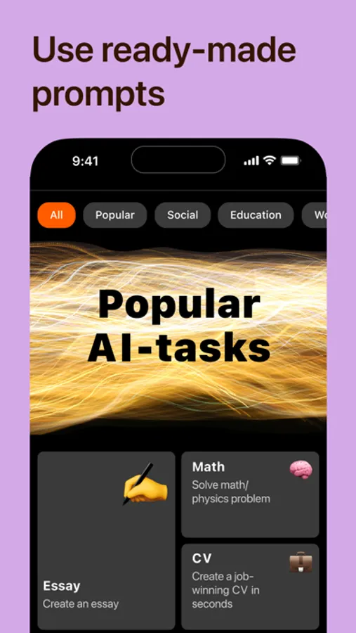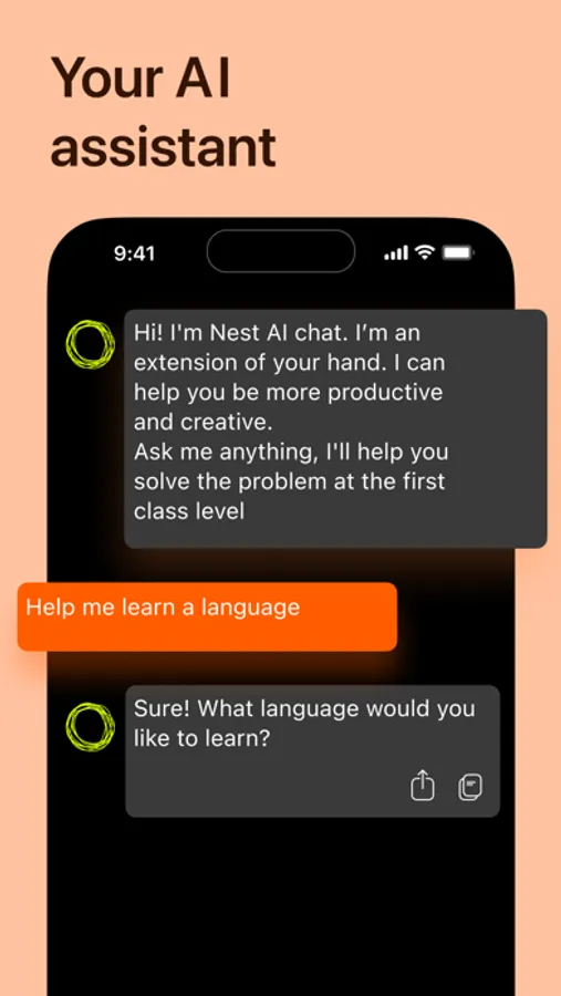 Using Nest AI Chat app can be a convenient way to get things done quickly and efficiently. Our app offers a wide list of presets that will show what tasks you can solve with AI Chat in one click, they are: