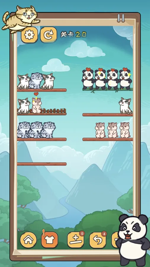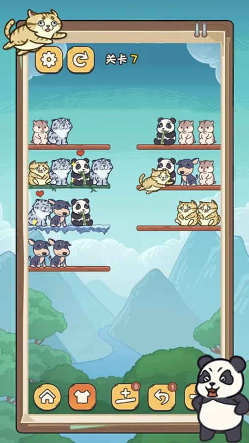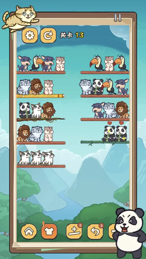 将相同的萌宠摆到同一根棍子上即可消除