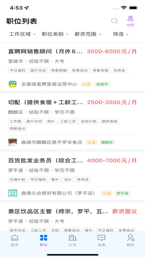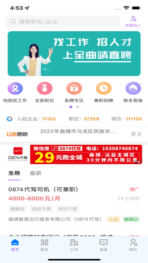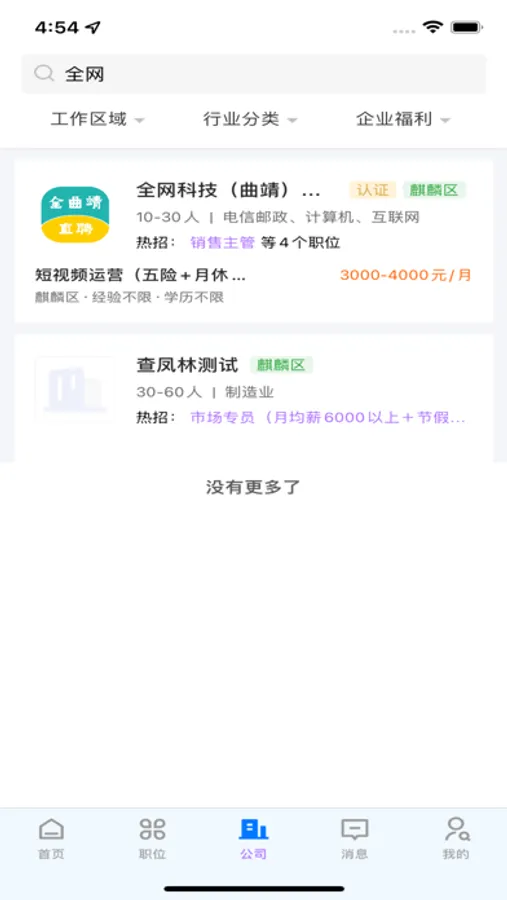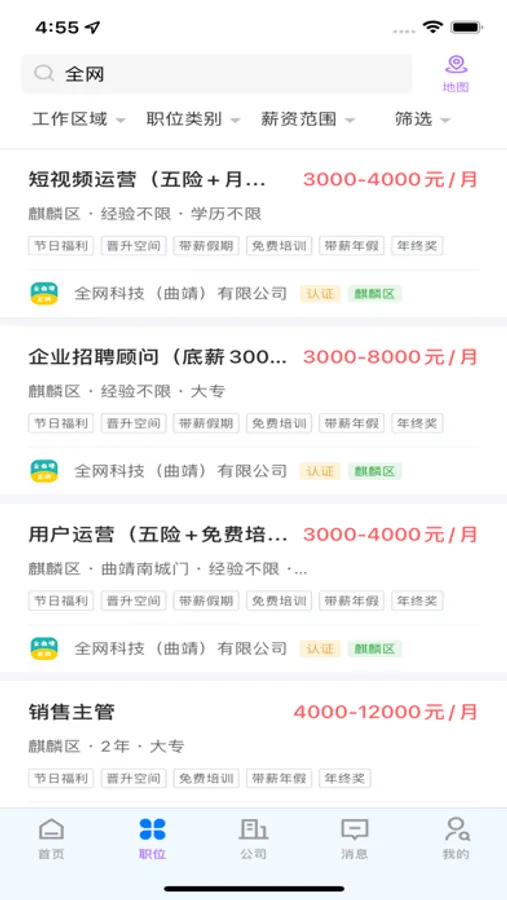 曲靖招聘、找工作,就看全曲靖直聘! 全曲靖直聘是全网科技(曲靖)有限公司旗下招聘网站,致力于为求职者提供曲靖本地优质招聘信息、为企业提供招聘渠道,帮助每一个求职者在全曲靖直聘找到合适的工作! 全曲靖直聘,搜索好工作!