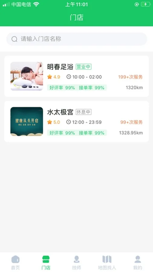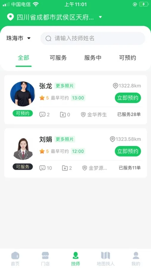 您可自选技师并查看技师的详细介绍(距离、头像、从事经验、状态、评论),项目、下单、地址、支付,技师将收到您的订单来单提醒会立马联系您。