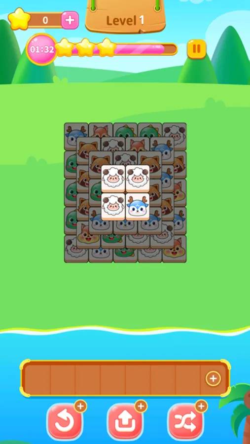 After entering the level, you will see 3D tiles with multiple cartoon patterns, such as: puppies, kittens, lambs, rabbits, hamsters, dinosaurs, monkeys, frogs, etc. Cartoon image, adorable your heart! There is a collection box below the tile. You can only put up at most seven cute pet tiles. If you want to add the placement area, click the additional number to operate.