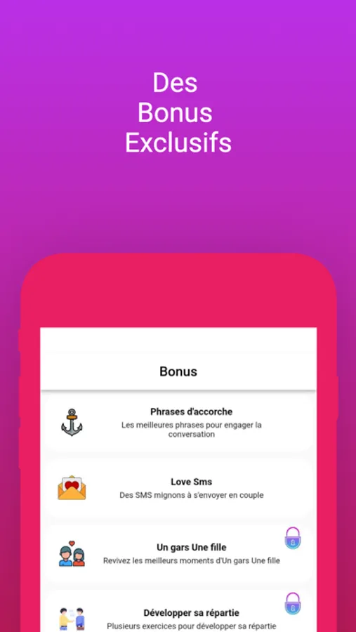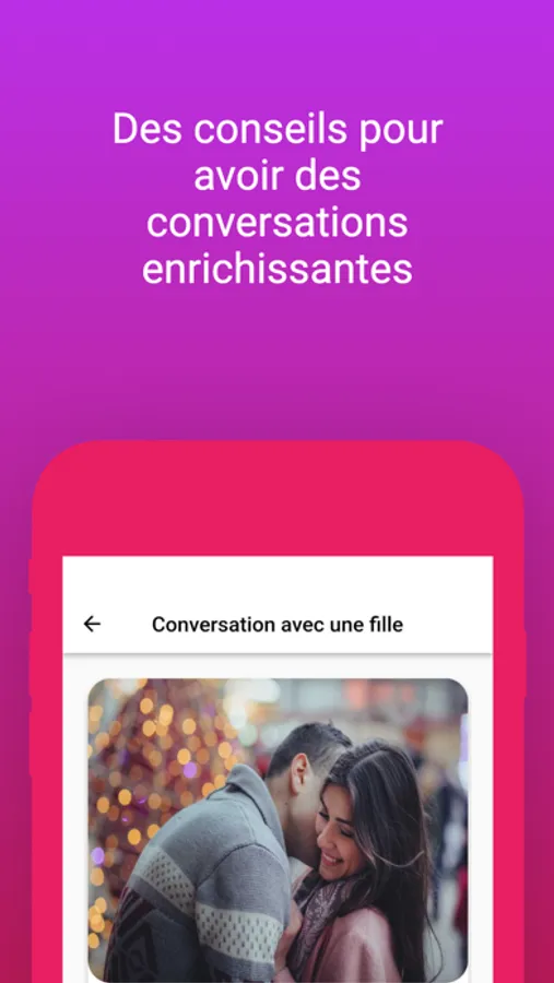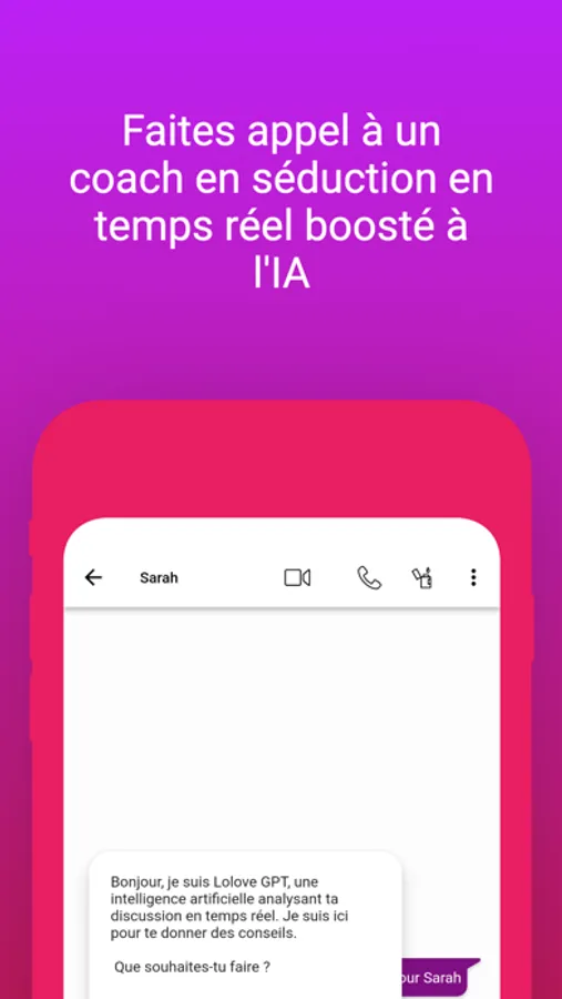 Notre application est dotée d'un coach virtuel en séduction basé sur l'intelligence artificielle qui vous aidera à améliorer vos compétences en matière de rencontres. Notre coach utilise des données provenant de millions d'utilisateurs pour vous donner des conseils personnalisés sur la façon d'améliorer votre profil et votre approche pour avoir plus de succès dans les rencontres.