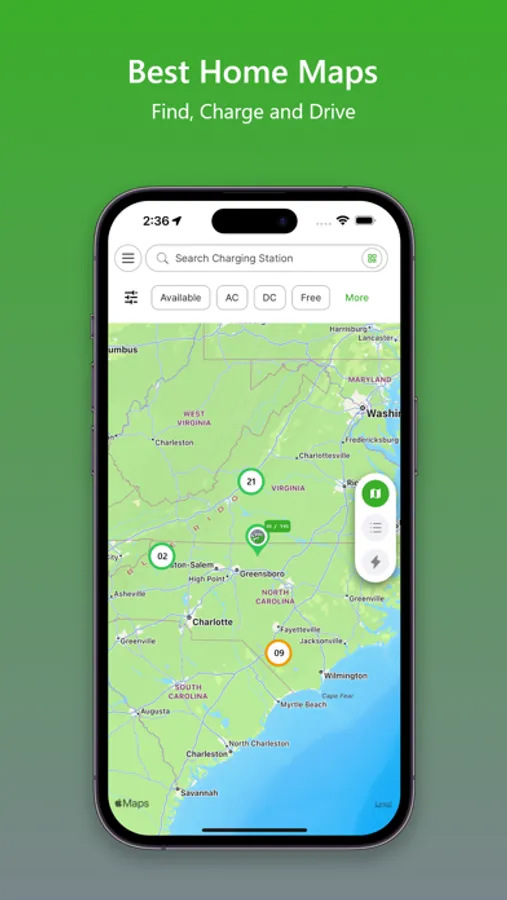 - Default Map with site cluster and with port status: The map view displays charging ports as clusters, making it easier to find the nearest one.