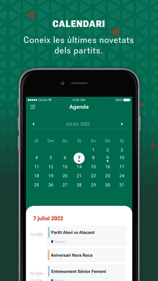 ● Calendari: Mantingues-te al dia amb les últimes novetats dels partits, esdeveniments i competicions.