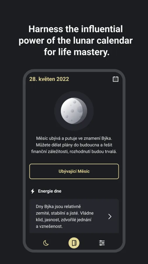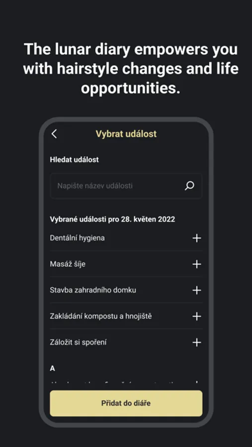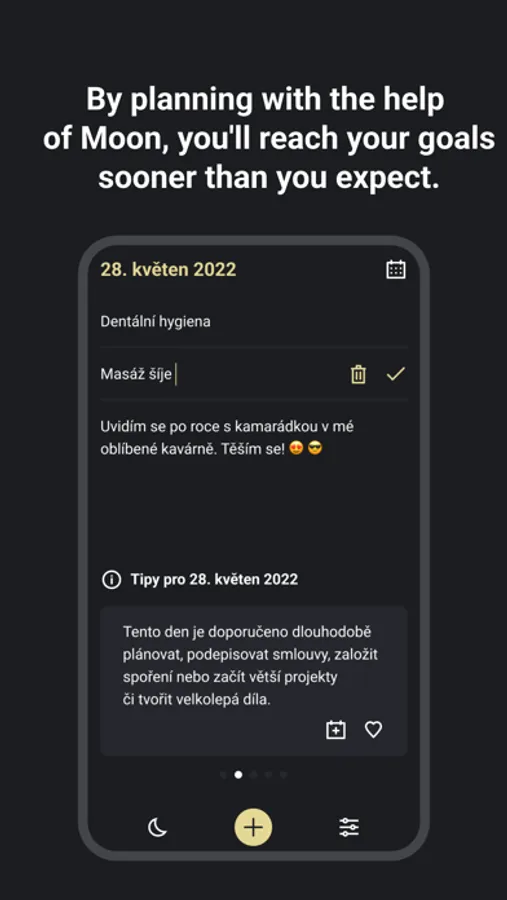 By planning with the Moon's help, you'll achieve your goals sooner than you expect. In your diary, you can see not only your activities, but also additional notes and wishes.
